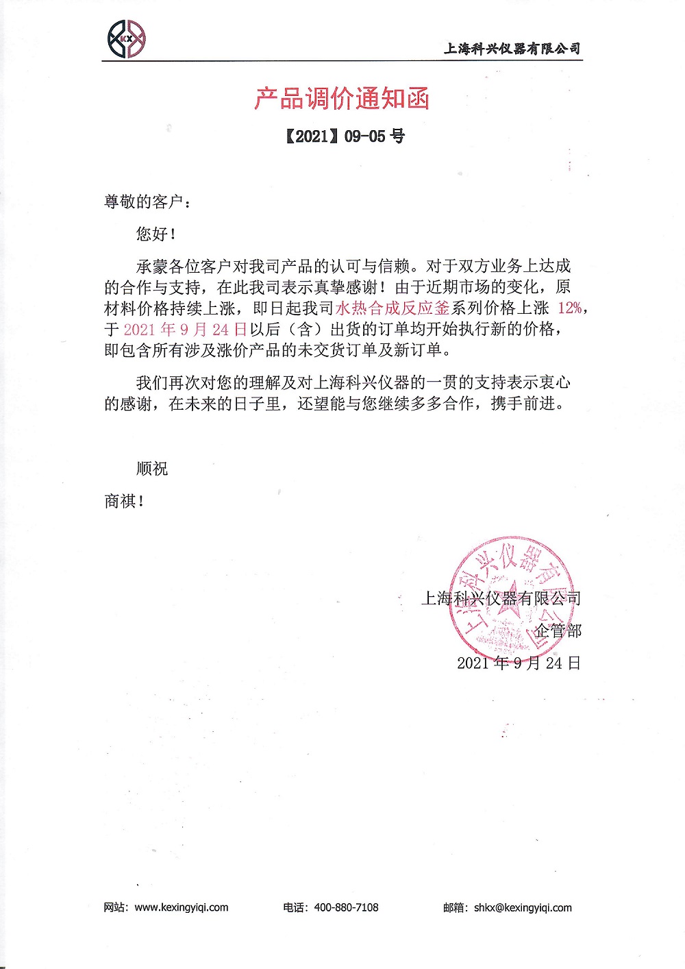 承蒙各位客戶對我司產品的認可與信賴。對于雙方業(yè)務上達成的合作與支持,在此我司表示真摯感謝!由于近期市場的變化,原材料價格持續(xù)上漲,即日起我司水熱合成反應釜系列價格上漲 12%,2021 年 9 月 24 日以后(含)出貨的訂單均開始執(zhí)行新的價格,既包含所有涉及漲價產品的未交貨訂單及新訂單。