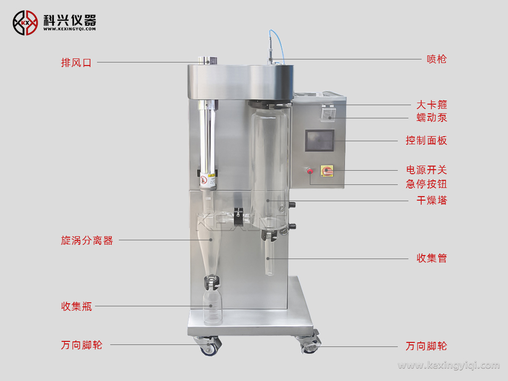 整機全不銹鋼制作;二流體噴霧的霧化結(jié)構(gòu),噴霧、烘干及收集系統(tǒng)采用透明的優(yōu)質(zhì)高硼硅耐熱玻璃材料制造